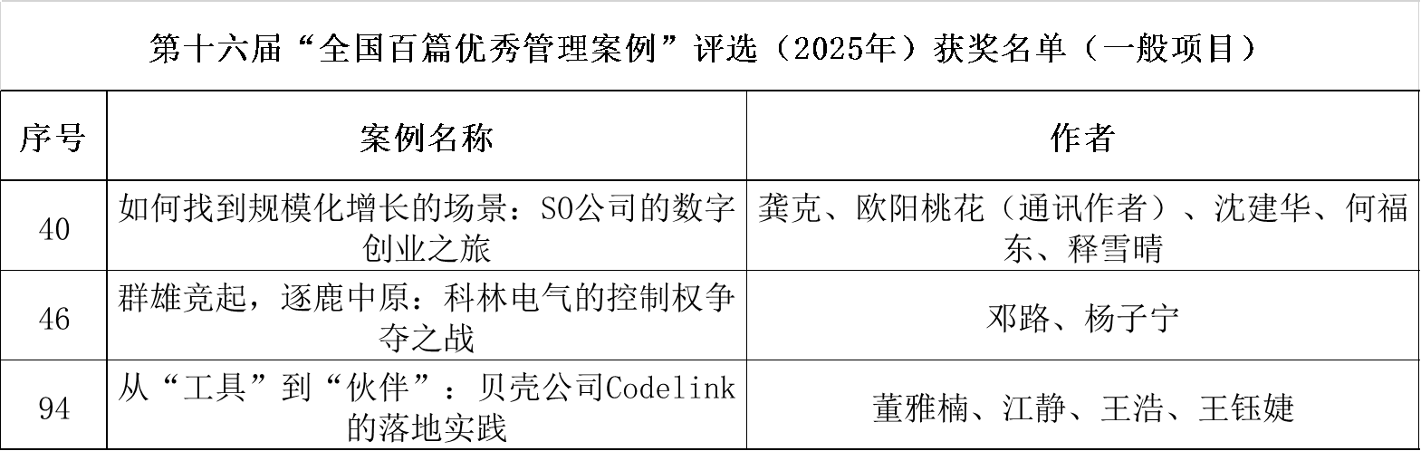 公司构建了“案例开发、案例教学与研究”相互促进、协同发展的创新教学模式,推动了一系列高水平案例成果的持续涌现。在案例开发方面,学院师生(包括MBA、MPAcc、MEM等专业硕士研究生)共同积极参与,成果显著。自2020年教育部学位中心启动首批主题案例项目立项以来,截至2024年,学院连续获批该类项目15项;首批视频案例立项7项;荣获全国典型及示范案例成果4项(该奖项每年全国仅评选20项)。截至2025年9月,学院累计有89篇管理案例入选“全国百优管理案例”,持续保持国内院校领先地位。案例建设赋能研究,学院教师依托案例研究方法,成功完成国家自然科学基金项目多项(含重点项目1项),国家社会科学基金重大项目1项(“企业创新主体地位强化及技术创新能力提升研究”,负责人欧阳桃花,2021年立项)。2024年,案例研究成果《拨云见日——揭示中国盾构机技术赶超的艰辛与辉煌》获教育部高等学校科学研究优秀成果奖(人文社会科学)三等奖。产出的80余篇案例研究论文发表于《管理世界》、 《Journal of Information Technology》等国内外重要学术期刊及会议。