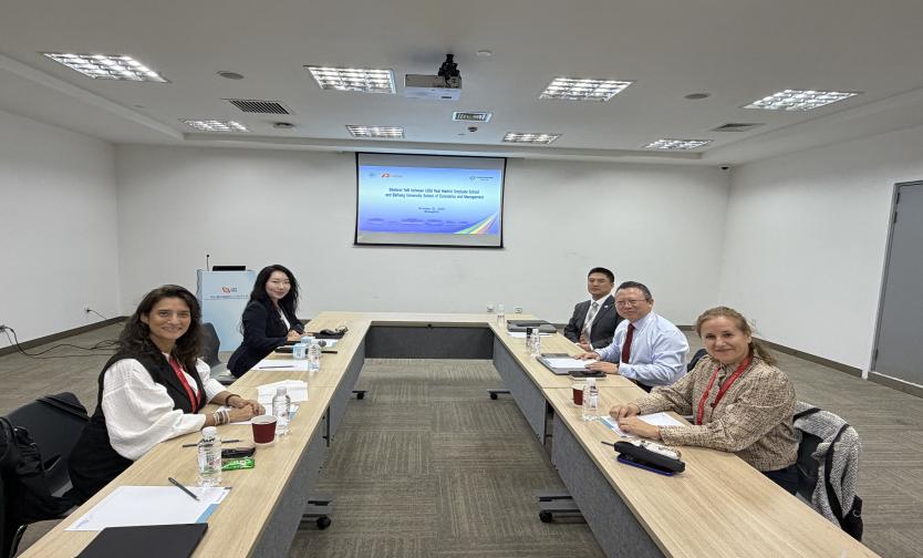 经理范英教授、管理科学与工程系孙晓蕾教授、学院外事助理郝壮副教授与里约热内卢联邦大学理工学院总监Thiago Gomes de Lima教授举行会谈