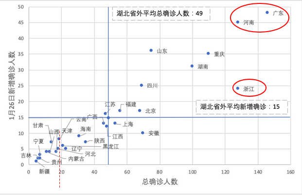 根据2020年1月26日的全国累计确诊人数空间分布情况显示,湖北、广东、河南和浙江几省压力较大,属高风险区域。其中浙江和河南虽然累计的病例相近,但从新增的数量来看,河南地区的压力相对更大。